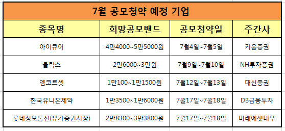 7월 기업공개(IPO) 시장은 제약업종 기업들이 대거 증시에 입상할 것으로 예상된다. 나아가 다음달엔 12년 만에 롯데그룹 계열사인 롯데정보통신이 국내 증시 상장에 나서 눈길을 끈다.