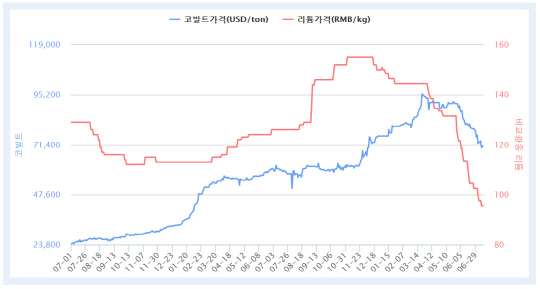 ▲2016년 7월 1일∼2018년 7월 10일 리튬과 코발트 가격 추이. (단위=톤당 달러, 표=한국광물자원공사) |
