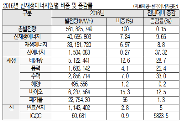 19일 산업통상자원부와 한국에너지공단에 따르면 가장 최신 통계인 2016년 기준 우리나라 신재생에너지 발전량은 총 4065만 5803MWh으로 총 발전량 7.24%를 차지한다. 태양광 발전량은 이중 12.6% 수준인 512만 2441MWh 규모에 불과하다. 보급량을 보면 신재생에너지는 1차 에너지 보급량의 4.81%인 총 1417만 8000TOE(석유환산톤) 규모며, 태양광은 이중 7.7%(109만 2800TOE) 수준이다. 정부는 2030년까지 원전 35기에 해당하는 48.7GW 규모를 태양광과 풍력 등 신재생에너지로 충당한다는 방침이다.