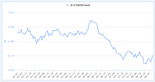 한편, 뉴욕에서 이뤄진 구리 선물 거래는 지난 금요일 톤당 5950달러에 폐장했다. 무역전쟁으로 인한 세계 수요 둔화 우려로 구리 가격은 지난 6월 4년만에 최고치를 기록한 이후, 18% 이상 하락한 상태다.