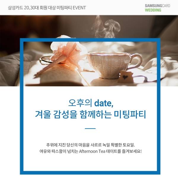 오는 12월 15일 샤로수길에 위치한 분위기 좋은 카페 시트론오피스에서 진행 예정인 애프터눈 티 미팅파티는 삼성카드 회원 가운데 20~30대 미혼남녀 각 8쌍(총 16명)을 대상으로 하며 참가비는 무료다.
