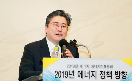 ▲18일 에너지미래포럼이 주최한 조찬간담회에서 산업통상자원부 정승일 차관이 2019년 에너지 정책방향에 대해 설명하고 있다. |