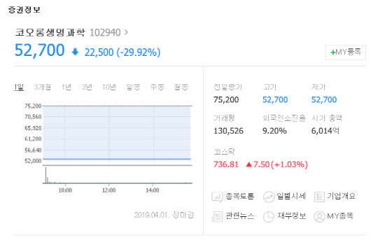 ◇ 코오롱생명과학 해명에도....주가 하한가 직행