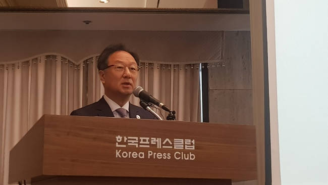 ▲이우석 코오롱생명과학 대표가 1일 서울 중구 프레스센터에서 기자간담회를 갖고 인보사 판매 중단 배경에 대해 설명하고 있다.(사진=나유라 기자) |