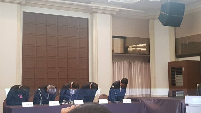 ▲1일 서울 중구 프레스센터에서 코오롱생명과학 임원들이 인보사 판매 중단에 대해 고개를 숙이며 사죄했다.(사진=나유라 기자) |