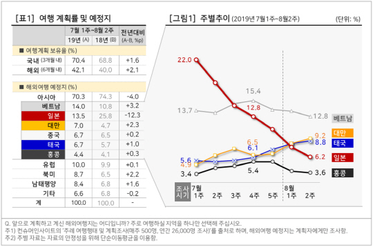 이 기간 해외여행 계획률은 42.1%로 전년보다 2.1%p 상승했다. 일본여행의 이탈이 컸지만 해외여행 전체 수요에 영향을 끼치지는 않을 것으로 보인다. 일본 여행 위축이 해외여행 위축으로 이어질 것이라는 우려와 달리 지금까지는 목적지 재편으로만 나타나고 있다.