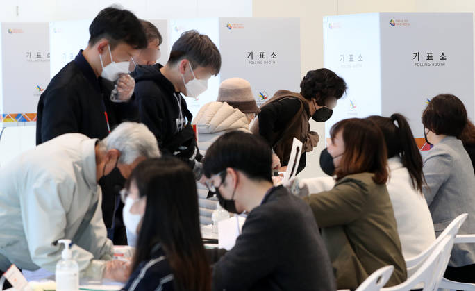 ▲제21대 국회의원 선거일인 15일 오전 강원 춘천시 거두리의 한 자동차 대리점에 마련된 투표소에서 유권자들이 신분 확인을 하고 있다. (사진=연합) |