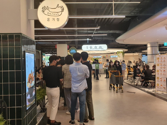 ▲체류형 복합쇼핑몰로 리뉴얼 오픈한 이마트타운 서울 월계점의 더타운몰 식당가에 오픈 첫날인 28일 소비자들이 길게 줄을 서 있다. |