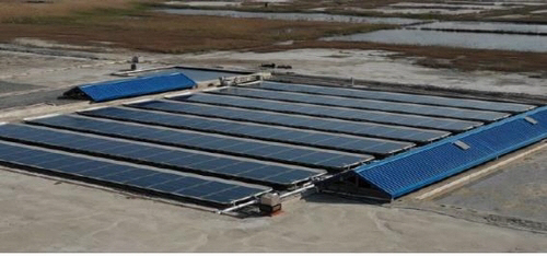 ▲한국전력이 최근 녹색에너지연구원, SM소프트웨어와 공동으로 개발한 100㎾급 염전 태양광 발전시스템. 한국전력 |