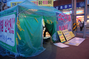서산시청에 도착할 즈음 해가 지기 시작했고 텐트의 열린 입구를 통해 안을 들여다보니 농성하는 이들은 둥글게 앉아 이불을 덮고 있었다. 박정섭 계장은 천막 앞에 세워진 여러 패널들 중 하나를 들고 카메라 앞에 섰다. 그는 “아무도 제 목소리를 들어주지 않아 눈물도 많이 흘렸는데 이렇게 들어준 것만 해도 고맙다”고 말하며 미소 지었다.